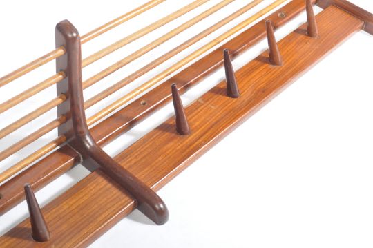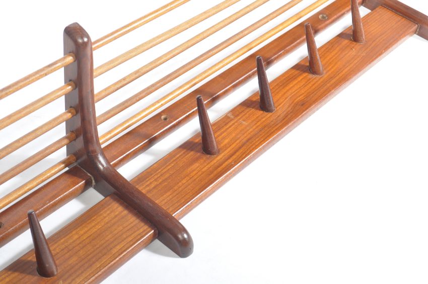 A superb vintage retro 1960's teak wood double wall hanging coat rack. The coat rack having atomic Eames influences having the conical forms to hang coats on and rack above. Bearing similarities to that of furniture made by ÚĽUV Praha. Measures; 122cm long.