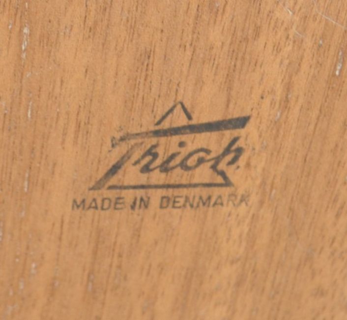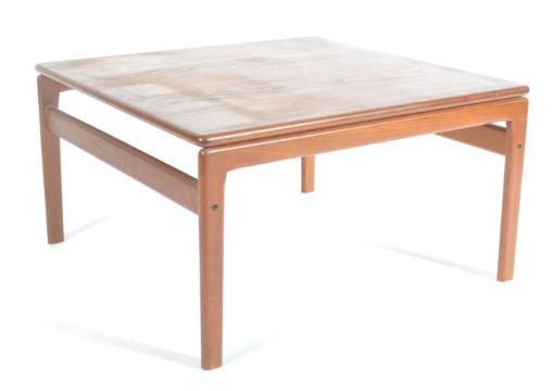 Trioh - A 1960's 20th century retro vintage teak wood square coffee table. The table comprising of flat side with tapering legs and stretchers between and a floating top. Applied stamp to underside. Measures; 41cm x 74cm x 74cm.