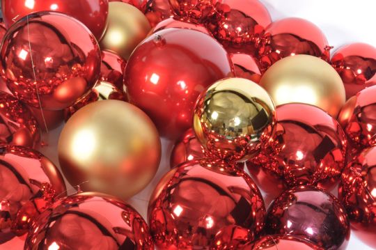 A collection of 58x large Christmas decoration baubles of varying sizes. The baubles are made of a shatterproof plastic and in red , deep red matte , gold and gold matte colourways. Measuring 30cm , 40cm and 50cm in diameter.  The decorations were used in the BBC TV production ' Mary , Mel And Sue's Big Christmas Thank You ' within ' The Great British Bake Off ' tent.