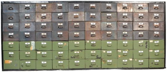 A 20th century vintage industrial 70 drawer metal filing cabinet locker from Australia. The cabinet having 40x drawers in base metal above 30x drawers painted in green, with each drawer having an index card holder and d-cup handles. The exterior being in black. Removed from Sydney Railway Station. Measures; 97cm x 230cm x 36cm.