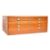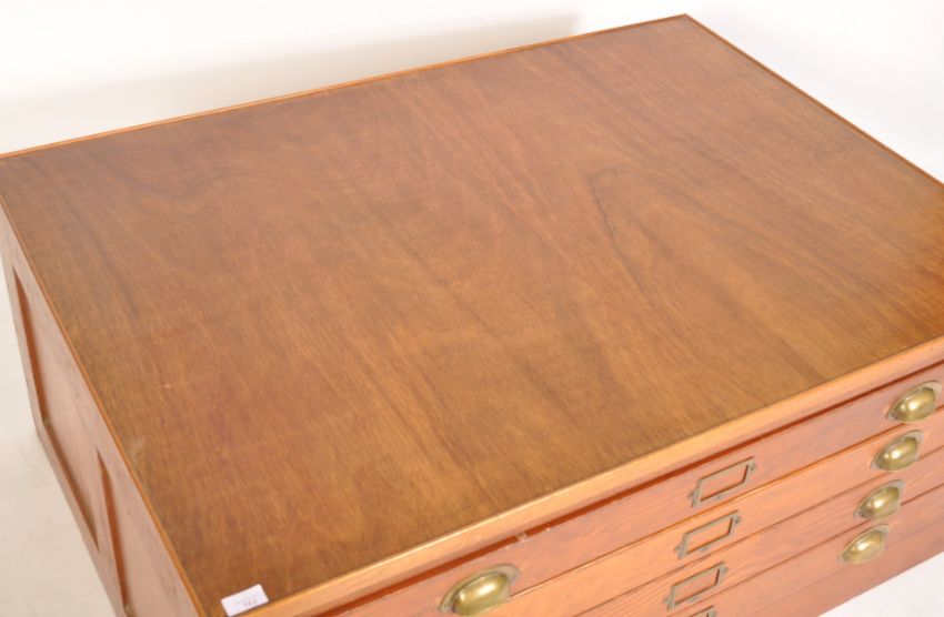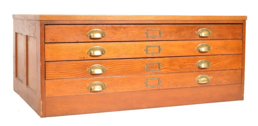 A mid 20th century retro vintage industrial large oak four drawer architects / school plan chest having brass D cup handles and brass index card holders to the front of each drawer also having panelled sides and slab top. Measures 51cm x 122cm x 89cm.