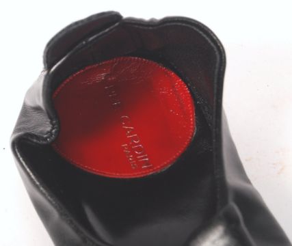 Pierre Cardin Paris - A pair of superb original 1970's retro vintage leather patent gents size 8 mule slippers with carrying case. The design being black leather with a red oval to the front of each and the inside heel of the slipper having a red circle with ' Pierre Cardin Paris ' in a silver gold, the slipper wall with ' E 151 3 ' in gold, the sole having the number ' 8 ' to each and right slipper having applied label ' Made in France '. There is a very similar pair in the V&A archives.  Measures 29 cm long and 10 cm wide.