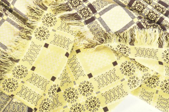 Tregwymt - A superb 20th century retro vintage welsh blanket having a vibrant uranium yellow colour ground with brown geometric repeating patterns throughout and a tasselled fringe. Measures; 235cm x 230cm.