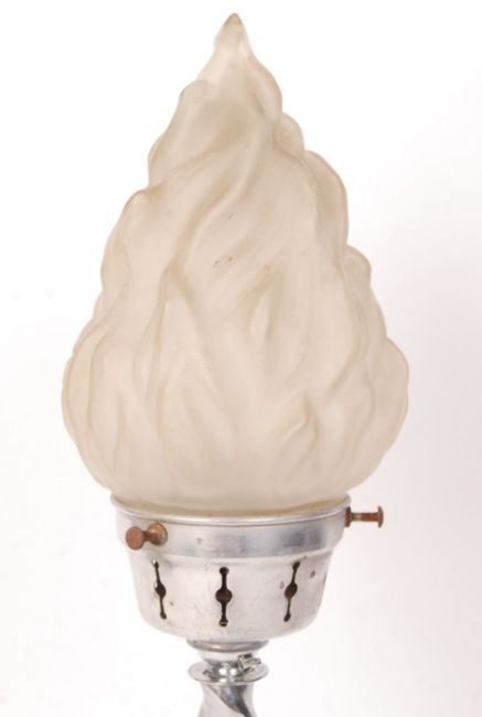 An early 20th Century 1930's Art Deco vintage industrial table lamp having a chromed metal barley twist stem on a round terraced base with switch and supporting a glass Olympic torch flame / Odeon Cinema lamp shade. Measure 53cm tall.