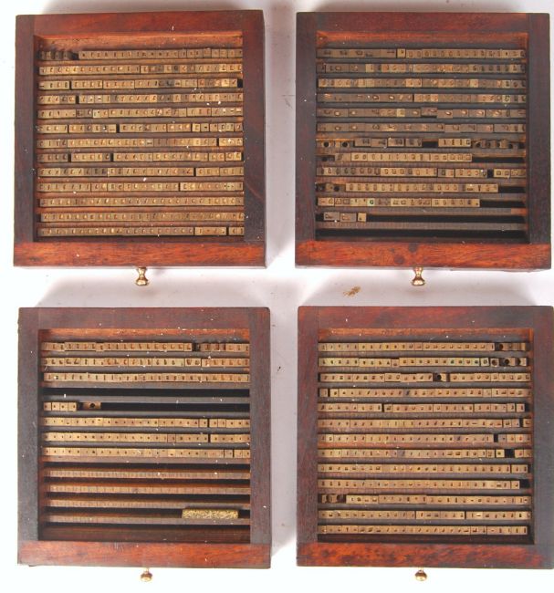 An antique vintage late 19th century to early 20th century small proportioned mahogany letterpress / printers chest. The chest comprising of twelve drawers each having brass knob handles, the chest being raised on brass bun feet. Each drawer containing largely full rows of 5mm brass letters , characters and punctuation markers. Measures; 24cm x 36cm x 18cm.