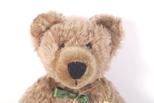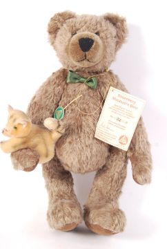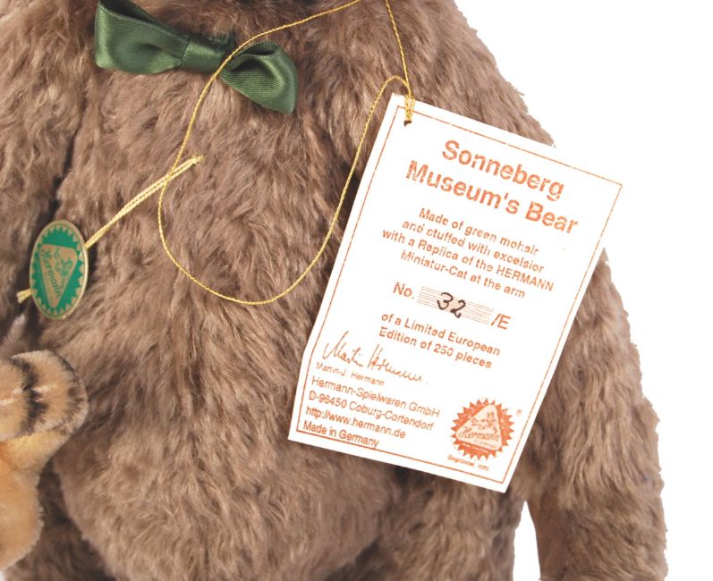 A Hermann made limited edition teddy bear ' Sonneberg Museum's Bear '. European edition. No. 32/e of 250. Brown mohair with kitten, and embroidered details to foot. Only ever displayed, complete with tags and certificate. Measures approx; 41cm tall.