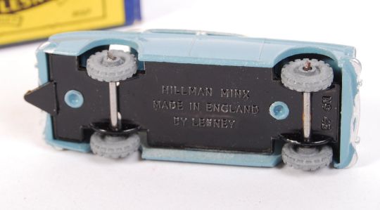 An original vintage Matchbox Moko Lesney made diecast model No. 43 ' Hillman Minx '. Blue/grey body with off white roof and metal wheels. Model appears mint to mint+, within a near mint original box.
