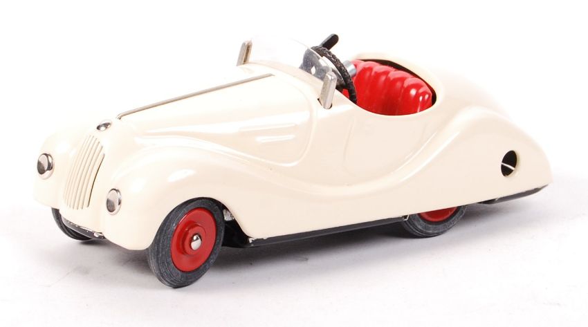A beautiful Schuco made ' Akustico 2002 ' tinplate clockwork car. White, with red wheel hubs and litho-printed dashboard. Appears mint, and complete. In full working order. Unboxed, and no key present. Measures approx; 15cm long.