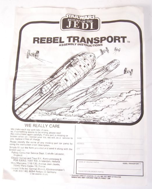 An original vintage Palitoy made Star Wars ' Rebel Transport Vehicle ' action figure playset. 100% complete, including covers, backpacks, gas masks and instruction manual. Within a good original ' Return Of The Jedi ' box.