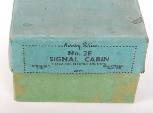 A rare vintage Hornby Series 0 gauge electric ' No. 2E Signal Cabin - Fitted For Electric Lighting '. Appears near mint condition, within the original green Hornby box. Beautifully litho-printed tin construction, with hinged roof and rear for access. Within its original green Hornby Series box. Measures approx; 18cm tall.