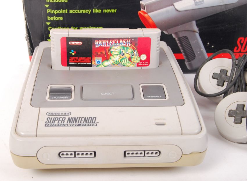 An original vintage Nintendo made Super Nintendo Entertainment System ( SNES ) computer games console and games. The lot comprising; SNES console , 2 x official controllers , official AC adapter and a boxed Nintendo Scope with the original Scope 6 game cartridge also to include Battle Clash , Street Fighter II , Super Wrestle Mania , Street Fighter II Turbo. Good vintage console. Untested.