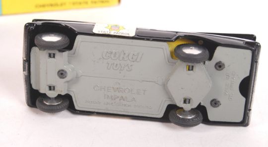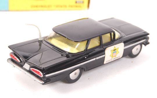 An original vintage Corgi Toys made diecast model No. 223 Chevrolet State Patrol car. Model appears in superb mint to mint+ condition (excluding decals). Within the original box (box 7/10). Rare in this condition.