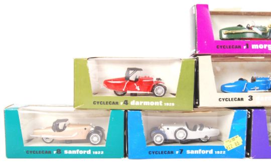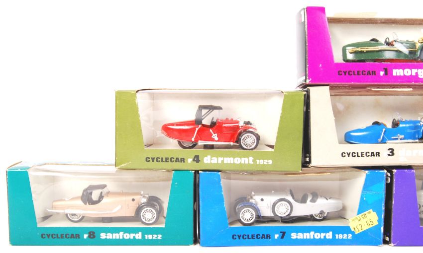 A collection of 8x Brumm 1:43 scale precision diecast model vehicles Serie Revival Cyclecar to include R1 Morgan 1923 , R2 Morgan 1923 , R3 Darmont 1929 , R4 Darmont 1929 , R5 Sanford 1922 , R6 Sanford 1922 , R7 Bedelia 1913 and R8 Bedelia 1913. All appear mint with their original box.