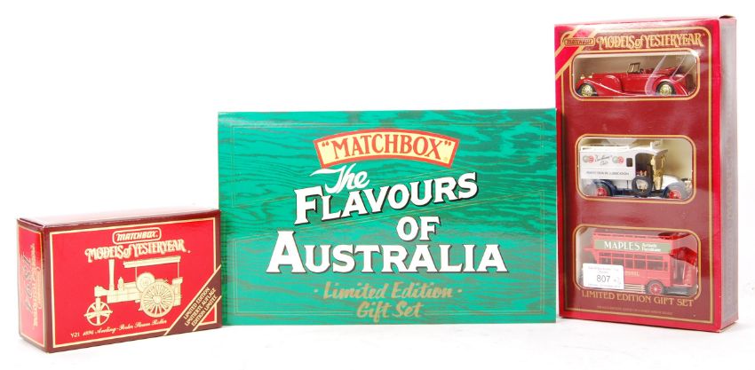 A collection of 3x Matchbox Models Of Yesteryear boxed limited edition diecast model sets. Comprising: ' Flavours Of Australia ' set, ' Limited Edition Gift Set ' 3-pack, and a Limited Edition Y-21 1984 Steam Roller. All contents mint.