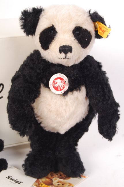 A collection of 3x Steiff made stuffed toy teddy bear Panda bears. The largest being 030512 (29cm tall, approx), with its original box. Along with 2x smaller Steiff made Panda bears. All appear as new, with all tags present. Only ever displayed.