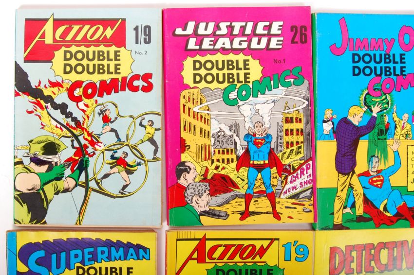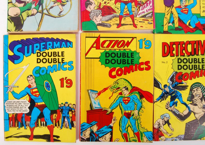 A good collection of vintage 1960's British made ' Double Double ' comic books / comics. All featuring Marvel / DC comic books / strips and characters. Allegedly made from the unsold copies of certain titles, and rebound in these new covers. Comprising: ' Batman Double Double Comics ' No.2, ' Superman Double Double Comics ' No.1 (no number of issue on cover), ' Detective Double Double Comics ' No.2, ' Action Double Double Comics # No.1 (x2), ' Jimmy Olsen Double Double Comics ' No. 1, ' Justice League Double Double Comics ' No. 1, and ' Action Double Double Comics ' No. 2. Rare collection of 1960's comic books.