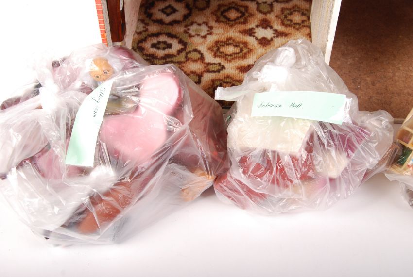 An original vintage possibly Triang / Triang style mock-tudor dolls house. Twin eaves, with faux beams. Open rear, with six rooms. Comes with a large quantity of assorted vintage doll's house furniture - as photographed. (Furniture will be bagged for transportation). No makers label, but likely c1960's / 1970's. Measures; H58cm x W78cm x D37cm Note: This lot can be delivered NATIONWIDE - example costs: Bristol from £30+VAT, London from £40+VAT, Birmingham from £40+VAT. All quotes based upon specific location, please contact us for a quote.