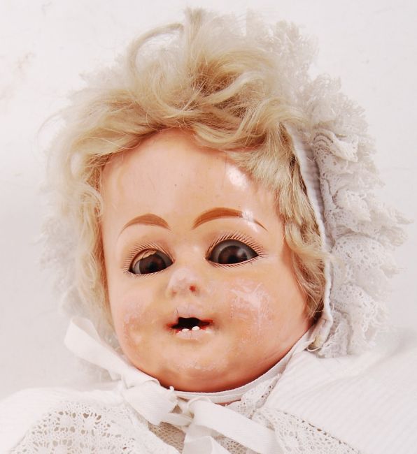 A collection of 3x vintage / antique dolls. Comprising of a composition headed likely French made composition doll - with brown inset eyes, and fine lace gown (cosmetic paint wear to face, some fingers missing - no makers name), a mid-century ' Dream Baby ' composition doll with moulded hair and sleeping eyes ( some paint cracks to face, otherwise good) and a small Armand Marseille German made miniature doll (generally good, but eyes have fallen into head.) Interesting collection. Tallest approx; 41cm.