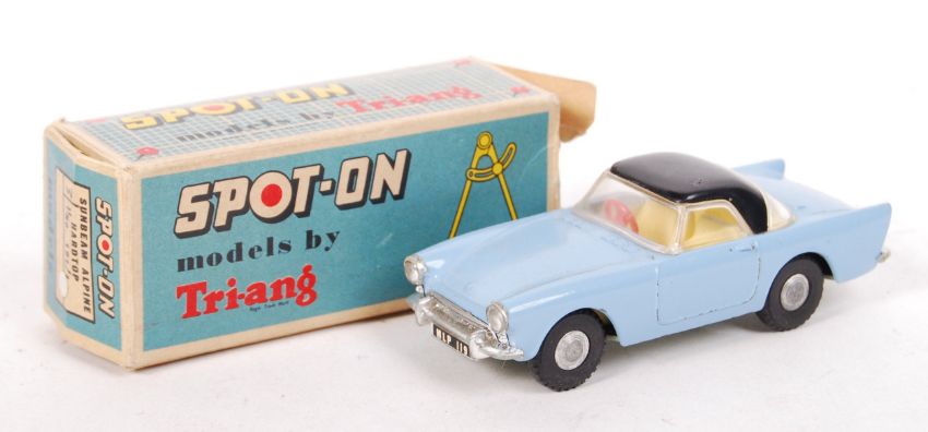 A rare vintage Spot-On / Spot On made Tri-ang 1:42 scale diecast model No. 191 ' Sunbeam Alpine Hardtop'. Blue, with black roof. Model appears near mint, with red steering wheel and pale yellow interior. Within its original and correct box, and complete with the leaflet to interior. Rare.