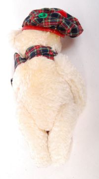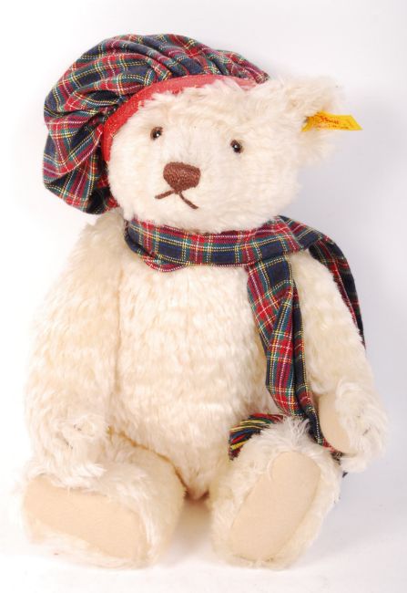 A 20th century Steiff teddy bear ' Hamish '. White mohair, with glass eyes. Complete with ear tag, hat and scarf. Measures approx; 35cm tall. Only ever displayed. Unboxed.