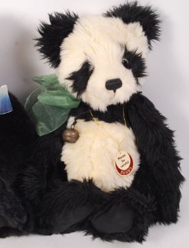 Two Charlie Bears made exclusive / limited edition teddy bears - both Pandas - to include CB35770 ' Chi Chi ', and a limited edition CB604662 ' Ming ' (3813/4000). Both black and white mohair. As new, with tags. Measures approx; 40cm tall.