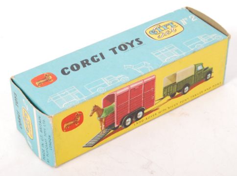 An original vintage Corgi Toys Gift Set No.2 ' Land Rover With Rice's Pony Trailer & Pony .' Model appears very near mint, complete with horse. Upon the original display stand, and within the original box (all very good - some pencil marks to box). Great gift set.