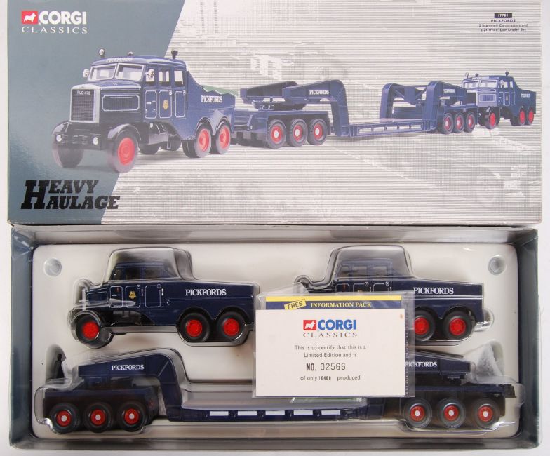 A good collection of 7x Corgi made boxed diecast model ' Pickfords ' models and sets. Comprising 3x Heavy Haulage sets (17502, 16601 and 17701 (still in its outer shipping box), 2x Corgi Classics sets 97956 and 97368, and others. Good selection. All models appear mint, within the original boxes.