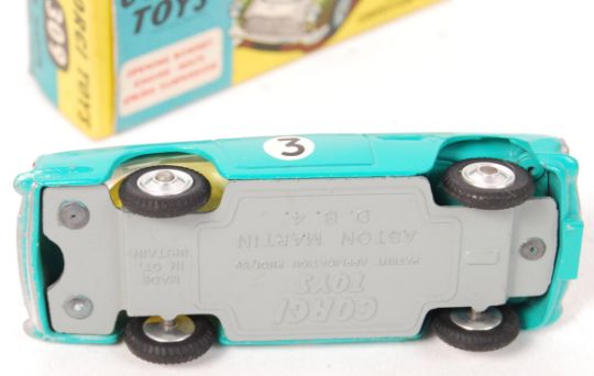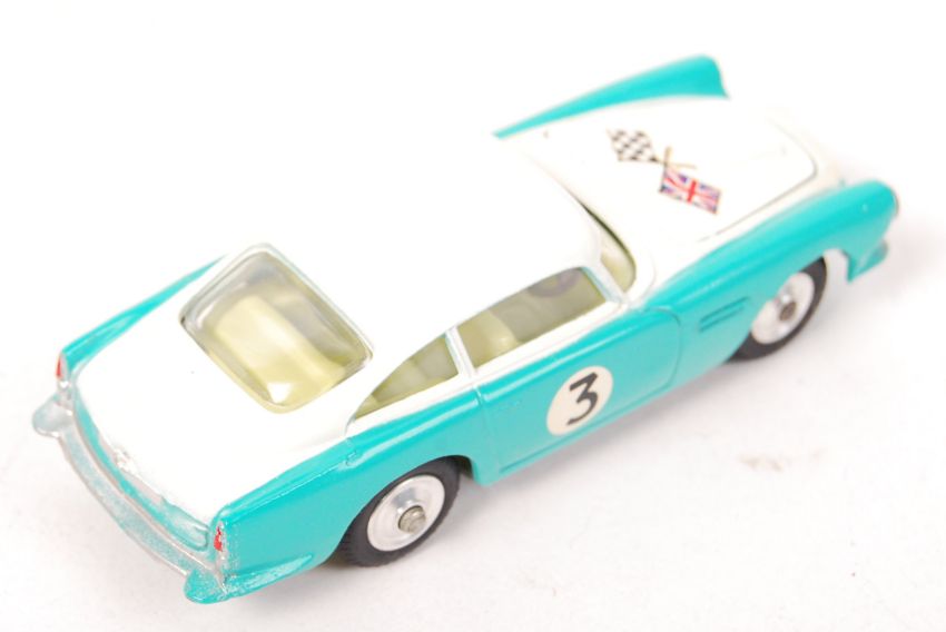 An original vintage Corgi Toys made boxed diecast model No. 309 ' Aston Martin Competition Model ' Two tone turquoise and white, with racing decals. Model very near mint (one of the nicest we've seen) with some minor wear to the passenger side decal and a few very small paint chips. Within a very good original box.