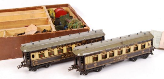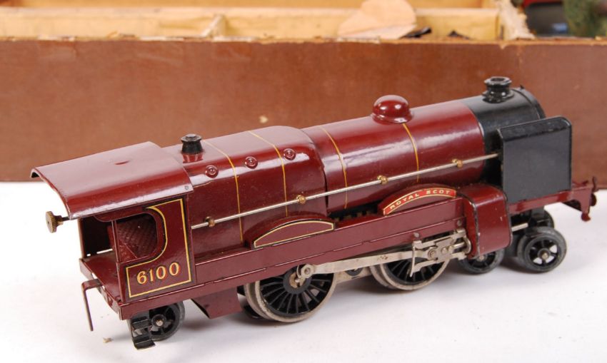 A rare early Hornby Series 0 gauge electric 20v train set, featuring 4-4-2 ' Royal Scot ' 6100 locomotive and tender. Maroon livery. Along with two Pullman coaches, track connectors and various scenic accessories. With instruction manual. All housed within a partial original box. Condition generally appears very good for age. A fantastic and charming early electric 0 gauge train set.