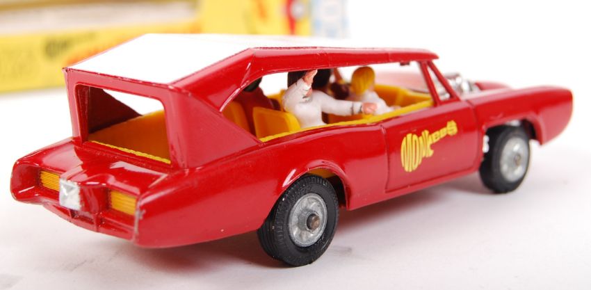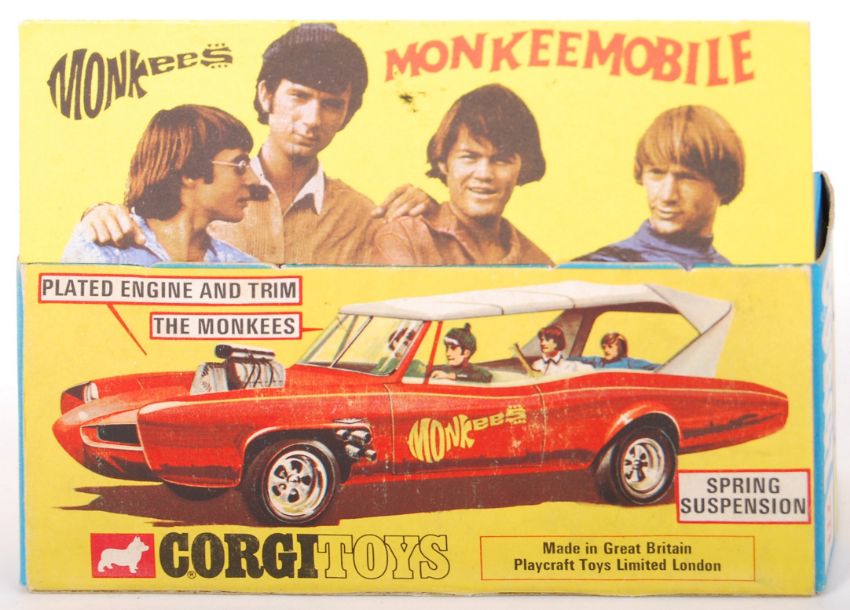An incredible original vintage ' ex-shop-stock ' Corgi Toys made diecast model No. 277 ' The Monkeemobile '. Incredible very near mint original model (minor paint chips to rear fins), believed never purchased from the original shop and just being a 'showcase' model. Retaining the incredibly rare original header card (these headers were made for shops to display the toy, but were never actually sold along with the model and would be removed prior to selling) which depicts all four Monkees with their iconic guitar shaped logo. Red, with silver plastic engine and all four Monkees figures. Complete with ' Corgi Club ' leaflet. One of the best we've seen of this type. Outer box is very near mint - some veining to the inner stand, and a very small 1cm split to the plastic window (top right corner). A very rare example of this classic Corgi diecast model.