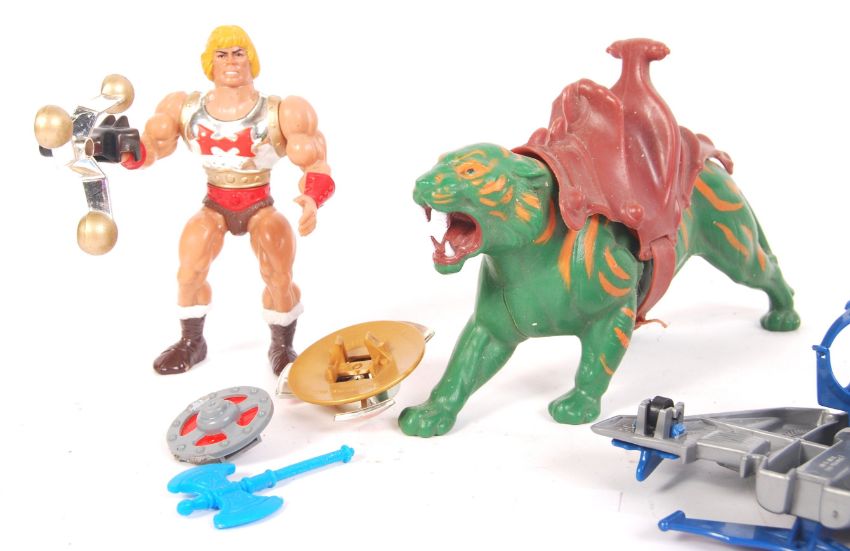 A collection of original vintage 1980's He-Man Masters Of The Universe ( MOTU ) action figures by Mattel, to include; Flying Fists He-Man ( appears complete, with weapons ) , He-Man Jet Sled ( complete ), Battle Cat and Skeletor ( with staff and weapons ). Great vintage figures.