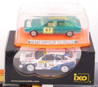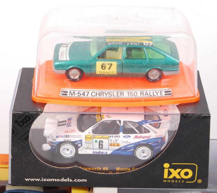 A good collection of 10x assorted 1:43 scale precision boxed diecast model cars. All appear mint, within the original boxes. To include; Solido (1023, 26, 73, and 61), Saico Ford Escort Mk1 RS 2000, Fina Lancia Delta HF, Cararama Mercedes Benz, IXO RAC022, Minichamps Ford RS 200, and Pilan made M-547. All appear mint. Great collection.