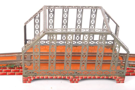 A rare original vintage Bing made 0 gauge tinplate model railway bridge. Appears complete, with both ramps present. Each part stamped with the BW makers mark for Bing. Measures approx; 80cm long.