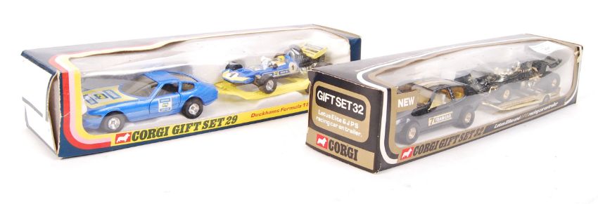 Two original vintage Corgi scale diecast model gift sets to include; Gift Set 29 GS29 Duckhams Formula 1 Surtees Racing Set and Gift Set 32 Louts Elite & JPS Racing Car On Trailer. Both appear mint in their original boxes.