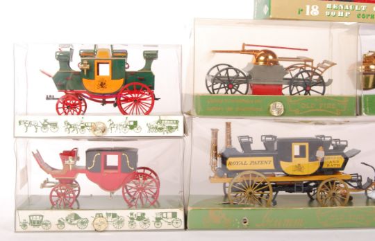 A collection of 7x assorted Brumm 1:43 scale precision diecast model from various series: Serie Oro R18 ' Renault G.P. 3B 90HP Corsa 1906 , Serie Old Fire X6 Veicolo a Turbina Di Verbiest 1681 ' , Serie Old Fire X3 Gurney's Steam Stage Coach 1828 , Serie Old Fire X1 Cugnot's Fardier , Serie Old Fire X2 Newton's Cart , 17 Mail Coach 1825 and 5 Landau. All appear mint in their original boxes. Good collection.