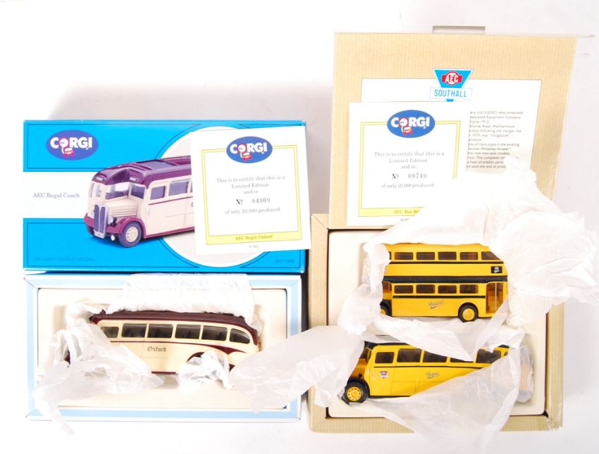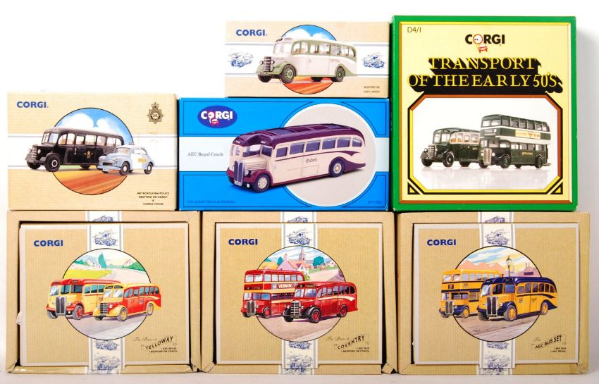 A collection of Corgi scale diecast model coaches to include; 97189 AEC Regal Coach , 97698 Metropolitan Police Bedford OB Coach & Morris Minor , 98163 Bedford OB Grey Green , D4/1 Transport Of The Early 50's set , 97061 The Buses of Coventry set , 97063 The Buses Of Yolloway and 96990 The AEC Bus Set. All appear mint in their original boxes.