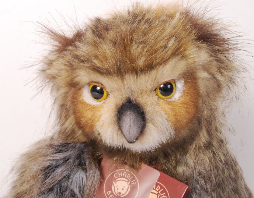 A limited edition Charlie Bears ' Flying Officer Hootie ' CB641506 stuffed toy owl teddy bear. No. 764/3000. Appears as new, with tags and certificate tag. Measures approx; 34cm tall.