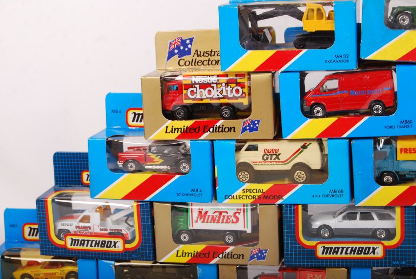 A collection of vintage Matchbox 1-75 series boxed diecast model cars. All ex-shop stock, mint and unused. Within the original boxes. Largely advertising related, some limited edition.