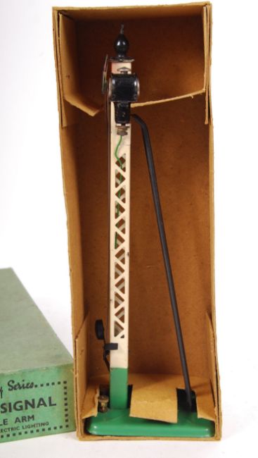 A rare vintage Hornby Series 0 gauge electric ' No. 2E Signal - Single Arm '. Appears very good condition, within the original green Hornby box. Measures approx; 29cm tall.