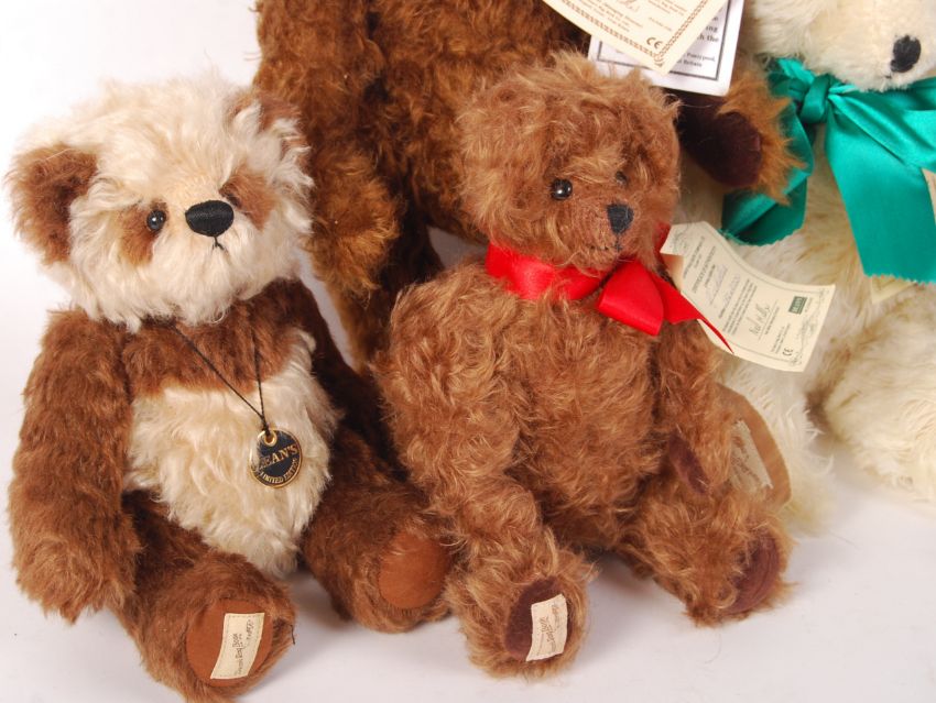 A collection of 8x Dean's Rag Book Company made limited edition Collector's Club bears. All only ever displayed, all mint, with their certificate tags. Comprising: Llewelyn (53/200), Dennis (229/2000), Anderson (112/200) (moving head / tail), Binkie (46/50), Harry (19/42), Nicholas (282/2000), Bristol Blue (4/500), and Willy (1/100). Tallest bear measuring approx: 37cm