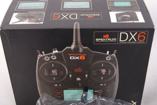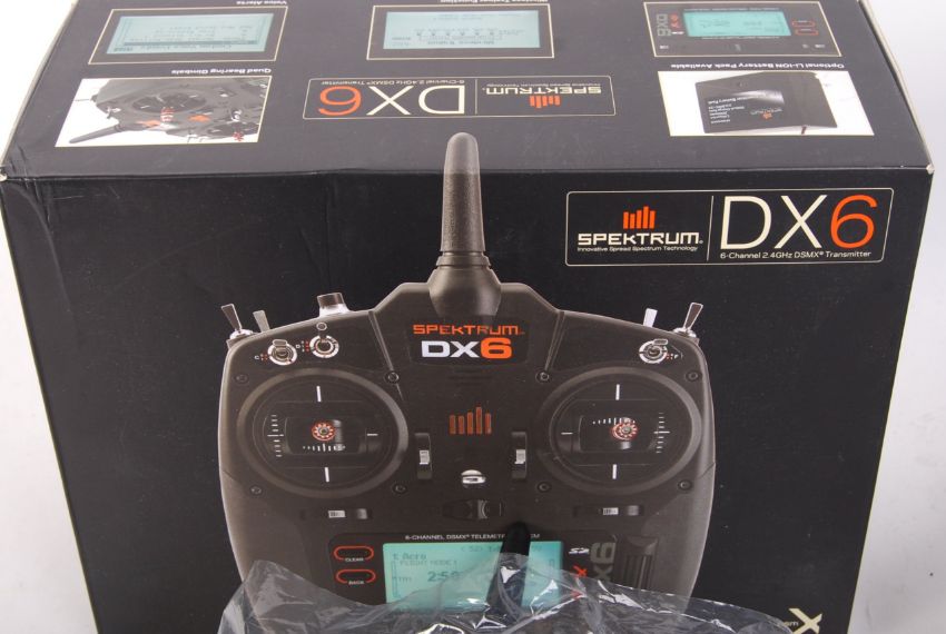 An 'as new' radio controlled radio gear transmitter by Spektrum. Model DX6 - ' 6 Channel 2.4GHz DSMX Transmitter '. Purchased, opened, and never used by the vendor - still in its cellophane bag. Complete with instruction manual, original 4x sealed batteries, receiver and all inner packaging. Along with a set of 6x servos, and assorted related unused radio gear items. All as new, and unused by the vendor.