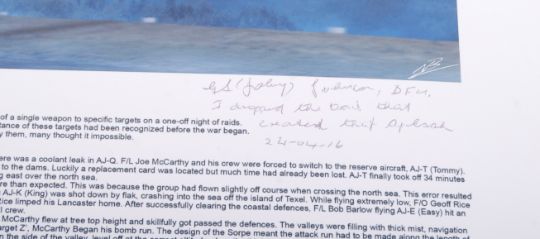 ' The Dambusters - Operation Chastise - 16th/17th May 1943 ' exclusive Digital Composite Artwork print by Nic Brown. Depicting the moment of impact from the bomb hitting the water during the attack on the Sorpe Dam. Signed by Dambuster 617 Bomb Aimer George Johnny Johnson who has added ' I dropped the bomb that created that splash!' and Mary Stopes-Roe (Daughter of Bouncing Bomb inventor Barnes Wallis). A beautiful print, with details of the raid beneath the image. Measures approx; 30cm x 46cm.