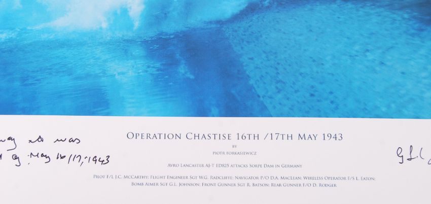 ' Operation Chastise 16th / 17th May 1943 ' by Piotr Forkasiewicz - a beautiful full colour print, uniquely signed by Bomb Aimer George Johnny Johnson who has added ' This is the way it was on the night of May 16th / 17th 1943 '. This beautiful print depicting the moment the bomb hits the water, during the Attack on the Sorpe Dam. 30cm x 45cm.