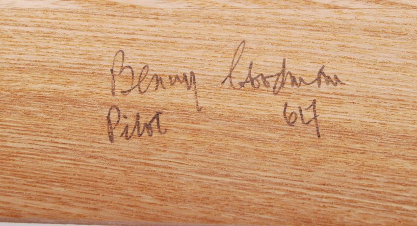 An original WWII Second World War Lancaster Bomber cockpit instrument 'dial'. The unit with Air Ministry markings, and various official stamps. The top features a viewing panel, which can be lifted to reveal a series of numbers. Likely an altimeter, timer or similar instrument. Along with a wooden presentation base, autographed by 617 Squadron pilot Benny Goodman. Created exclusively for this event. A rare original piece of Lancaster history. Base board measures; 21cm x 29cm.