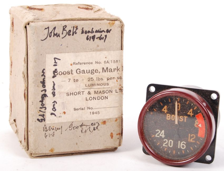 A rare original WWII Second World War Air Ministry issued Boost gauge, as fitted to Lancaster cockpits. Believed ex-stores, and supplied within its original box. ' 6A/1581 Boost Gauge Mark 111m '. Dated 1945. The gauge with various Air Ministry markings to verso. The outer box has been autographed exclusively for this event by 617 Squadron veterans - Dambuster George Johnny Johnson, Bomb Aimer John Bell and Pilot Benny Goodman. A fascinating item.