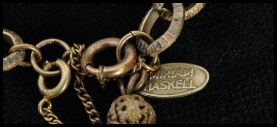 A 1940s signed Miriam Haskell gold-tone acorn charm bracelet having safety chain and spring hoop clasp. Measures 7.5 inches.