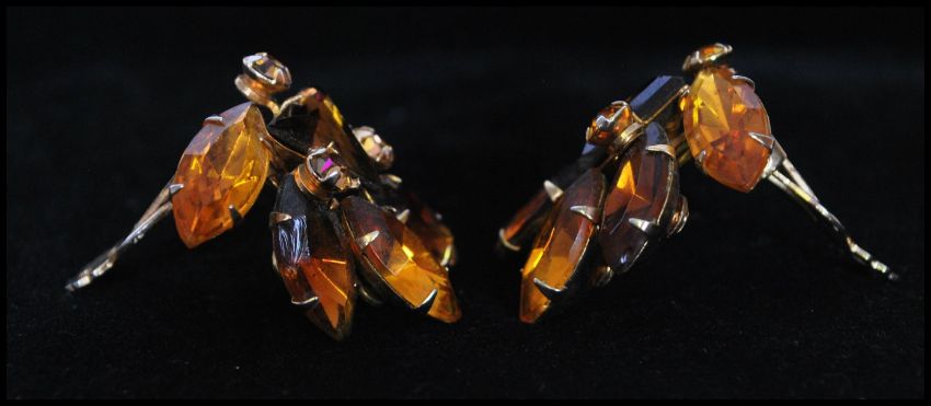 A pair of 1950s signed Beau Jewels earrings being set with shades of smokey brown rhinestones. Measures approx 1 inch.