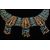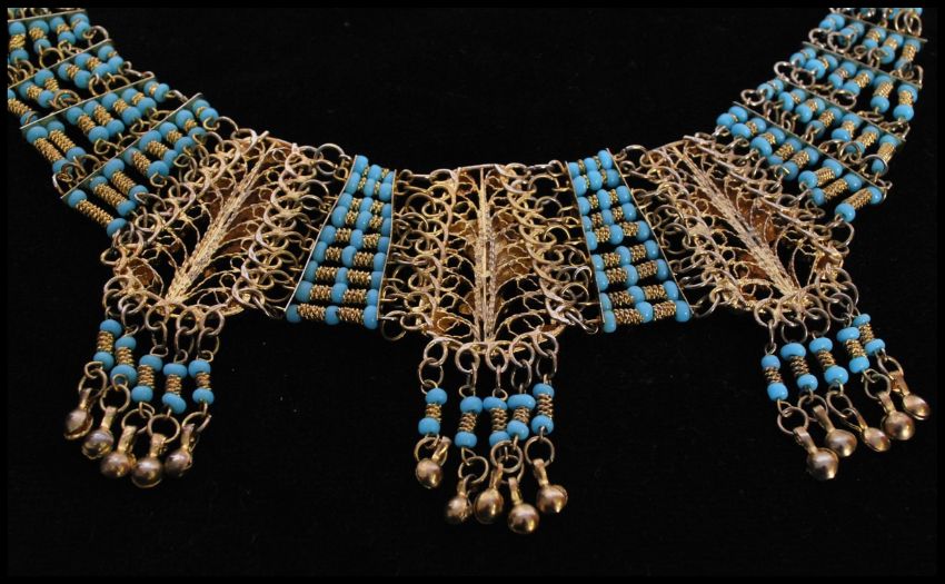 A vintage gold tone Egyptian style bib necklace with three large filigree work panels set with Pharaoh heads with tassel drops strung with metal and blue beads. Measures approx 18 inches.