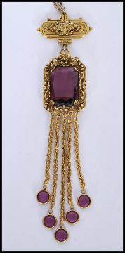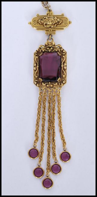 A vintage signed gold-tone drop necklace with large faceted purple glass stone with purple finial tassels. Signed Goldette. Chain measures 18 inches, pendant 6 inches.