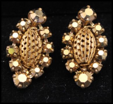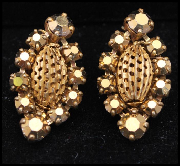 A 1950s signed Miriam Haskell gold-tone parure decorated with faceted gold beads, filigree work and  rhinestones, includes necklace, brooch, bracelet and clip earrings. Chain measures 14 inches, drop 3 1/2 inches.